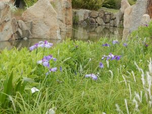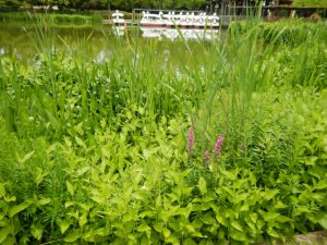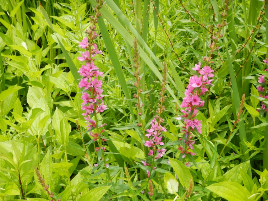 写真一枚目:東浦口ゲートそば、二枚目:ミソハギ、三枚目:ポンテデリア、四枚目:ハンゲショウ、五枚目:花火鳥そば、六枚目:ハナショウブ