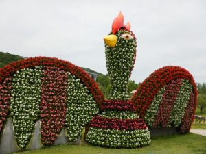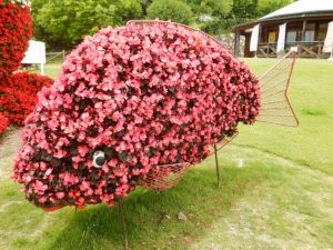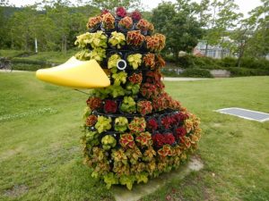 立体花壇「タコトピアリー 」「花火鳥」のベゴニア&「アヒル」のコリウス(場所:東浦口ゲート前・大地の虹)