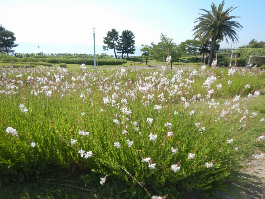 風にユラユラ白い蝶が飛んでいるような花、ガウラが咲き始めました。これから秋まで咲き続けます。海岸口ゲートそばは、天気のいい日はお花と一緒に海がきれいに見えますよ。