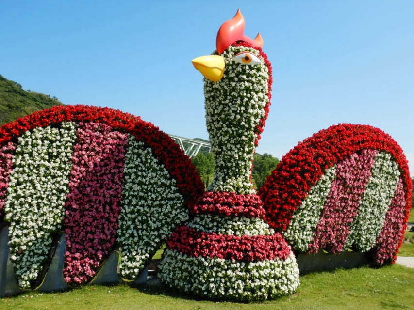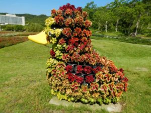 立体花壇「タコトピアリー 」「花火鳥」のベゴニア&「アヒル」のコリウス(場所:東浦口ゲート前・大地の虹