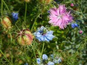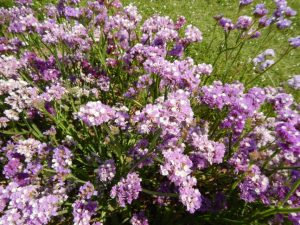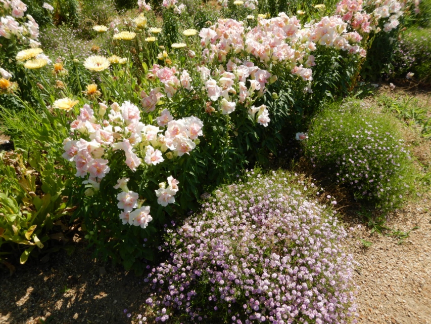ジギタリスやルピナスなどの目立つ存在のお花は終わりました。キンセンカ、キンギョソウ、ジプソフィラ、スターチス、ナデシコなどは、まだがんばって咲いています。