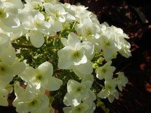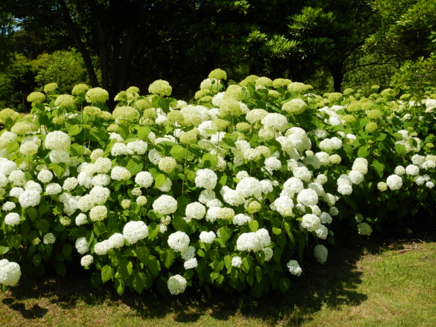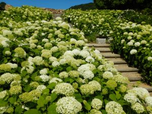 四季咲きアジサイやヒメアジサイなどが着々と咲き、見ごろになりつつあります。真っ白大輪で人気のアナベルは開花時期が多少遅いため、咲いている部分は比較的少なめです。