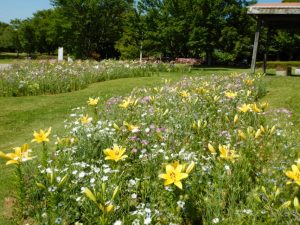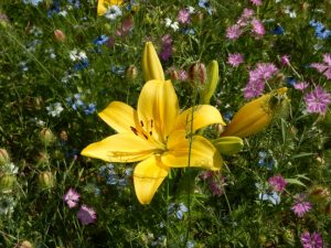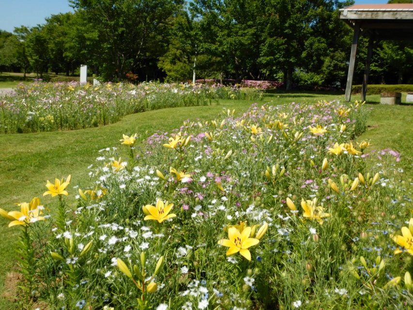 ユリ:咲き始め、 その周りの花:見ごろ  場所:ポプラの丘上段