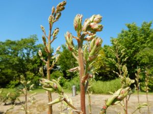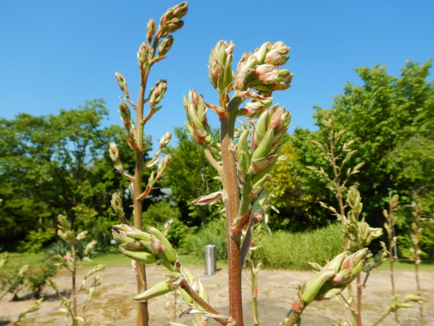 花茎が着々と伸びています。最終的には8m近くになり、開花は7月以降になると思います。数十年に一度開花する珍しい花らしいのですが、当公園では2~3年ごとに出てきております。