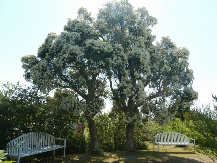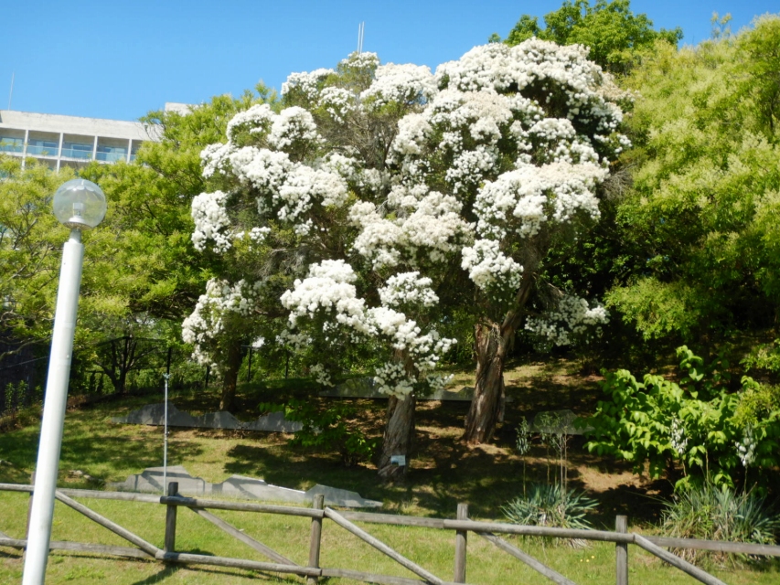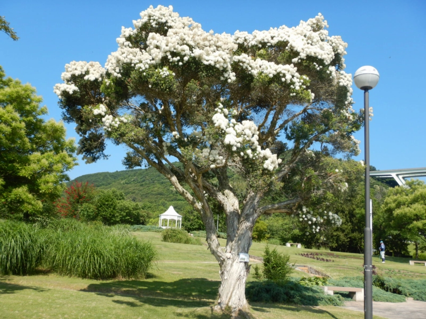 日差しの強いこの季節に、真っ白な雪が積もったように見える大きな木。まさに‘スノー・イン・サマー(夏の雪)’です。遠くからでも迫力あるし、近くからでも興味深いビジュアルです。先週より開花が進み、白い面積は増えていますが、先に咲いていた部分がくすみ始めています。徐々に白色が濁り、まるで道路わきの泥混じりの雪のようになってきますので、ご覧になりたい方はなるべくお早めに。