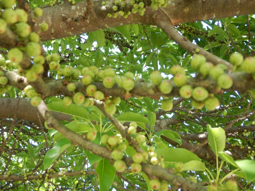 パッと見ると暑い日差しを避けるのに適した、単なる巨大な木です。が、下から枝をのぞいてみると、ミッチリミチミチに粒々ツブツブ~~~。嫌いな人はサブイボ出るくらいの気持ち悪さかも。1つ1つがイチジクみたいな形のお花なんですよ。見たことない人は是非見ていってください!