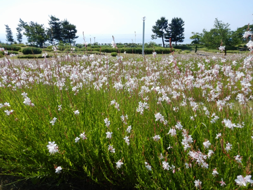 風にユラユラ白い蝶が飛んでいるような花、ガウラが着々と花数を増やしています。これから秋まで咲き続けます。海岸口ゲートそばは広範囲に咲いており、この時期はまだ雑草も少なくお勧めです。