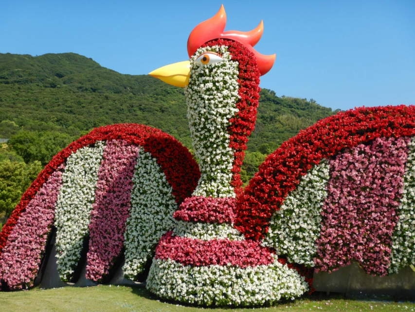 立体花壇「タコトピアリー 」「花火鳥」のベゴニア&「アヒル」のコリウス(場所:東浦口ゲート前・大地の虹)