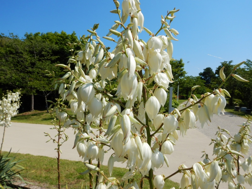 イトランは高さが150㎝前後もあるので、ボーッと立ったまま目の高さでお花を観賞できます。でもせっかくなので、名前の由来の糸状のものがピラピラついている葉っぱもかがんで見てみてね。