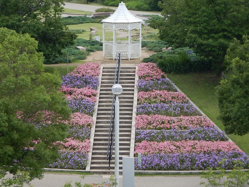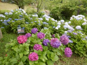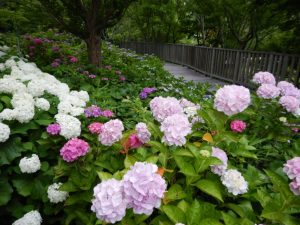空のテラス入り口向かってちょっと左側(淡路口ゲート方面)に薄暗い小道があるのですが、その周辺に色とりどりのアジサイが咲いていておススメです(写真4枚目)。