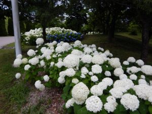 アナベルは見ごろの真っ白な花が多いですが、ピークを過ぎて緑色に戻っている箇所も出てきました。