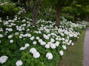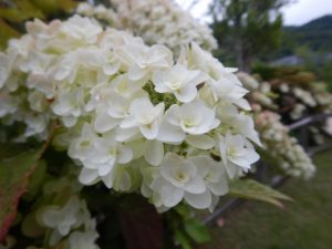 西洋アジサイやガクアジサイは場所によってはピークを過ぎ、茶色のシミが浮かんできているものもあります。