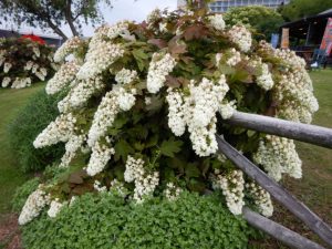 葉っぱがカシワの葉っぱの形に似ているカシワバアジサイ。茶色のシミが出てきているお花もあります。雨が降ってなくても下垂してきていますので、そろそろ終わりに近づいているようです。