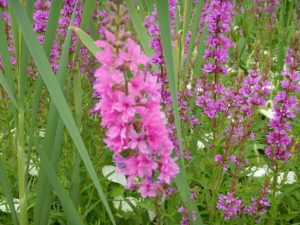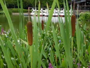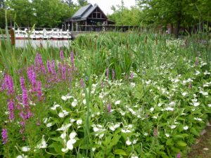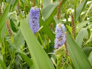 ハンゲショウの他、ポンテデリア、ミソハギ、ガマがご覧いただけます。