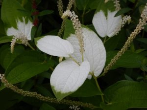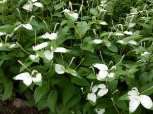 ハンゲショウは「半夏生」とも「半化粧」とも書くように、夏が近いこの時期に葉っぱが化粧(おしろい)をしたように白くなりますが、遠くからでもわかるほど白くなっています。ピークを過ぎるとまた徐々に緑色に戻りますが、7月上旬までは白い状態をご覧いただけると思います。