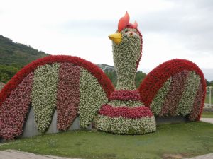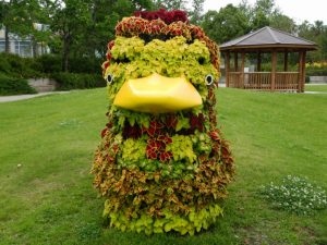 立体花壇「タコトピアリー 」「花火鳥」のベゴニア&「アヒル」のコリウス(場所:東浦口ゲート前・大地の虹)