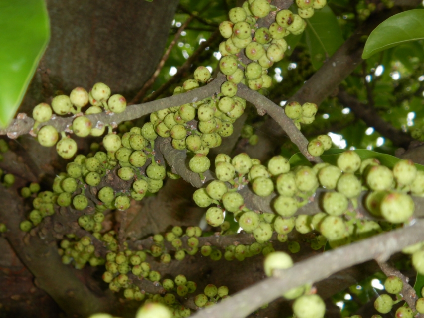 パッと見ると単なる巨大な木。が、下から枝をのぞいてみると、ミッチリミチミチに粒々ツブツブ~~~。嫌いな人はサブイボ出るくらいの気持ち悪さかも。1つ1つがイチジクみたいな形のお花なんですよ。写真よりも実物はもっと気持ち悪いので、見たことない人は是非見ていってください!