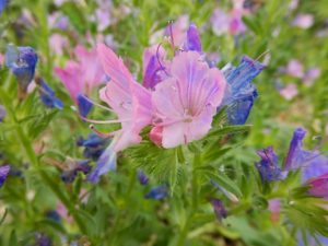 青、ピンク、白のお花があるエキウム。青やピンクは微妙なグラデーションが透明感を感じさせます。そして白いお花は水に濡れると本当に透明になるお花も?!雨の日限定でお楽しみいただけます(前回の「見ごろの花情報」参照)。