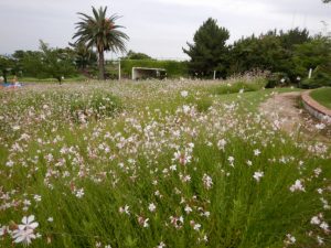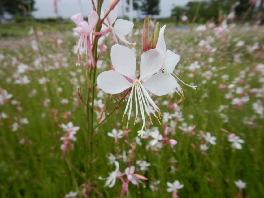 風にユラユラ白い蝶が飛んでいるような花、ガウラ。これから秋まで咲き続けます。海岸口ゲートそばは広範囲に咲いておりお勧めです。
