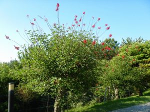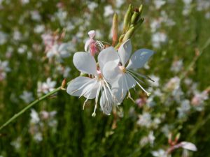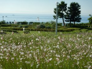 風にユラユラ白い蝶が飛んでいるような花、ガウラ。これから秋まで咲き続けます。海岸口ゲートそばは広範囲に咲いており、海もきれいに見えてお勧めです。