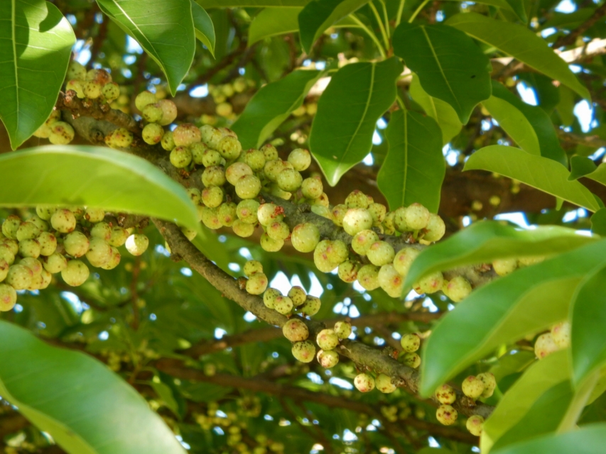 パッと見ると単なる巨大な木。が、下から枝をのぞいてみると、ミッチリミチミチに粒々ツブツブ~~~。嫌いな人はサブイボ出るくらいの気持ち悪さかも。1つ1つが1㎝位のイチジクみたいな形のお花なんですよ。写真よりも実物はもっと気持ち悪いので、見たことない人は是非見ていってください!