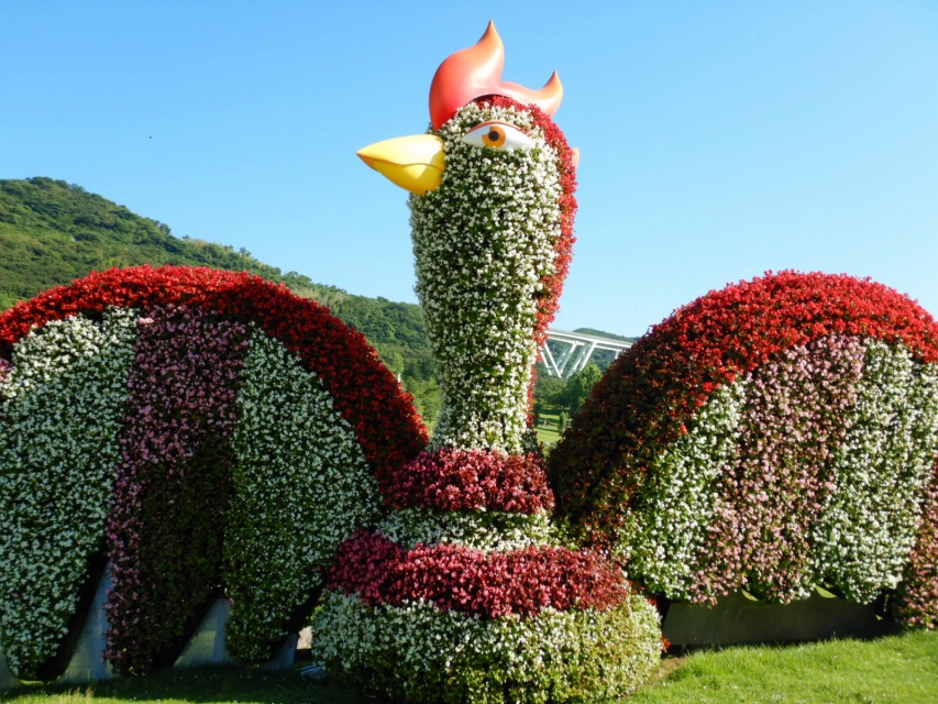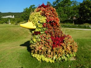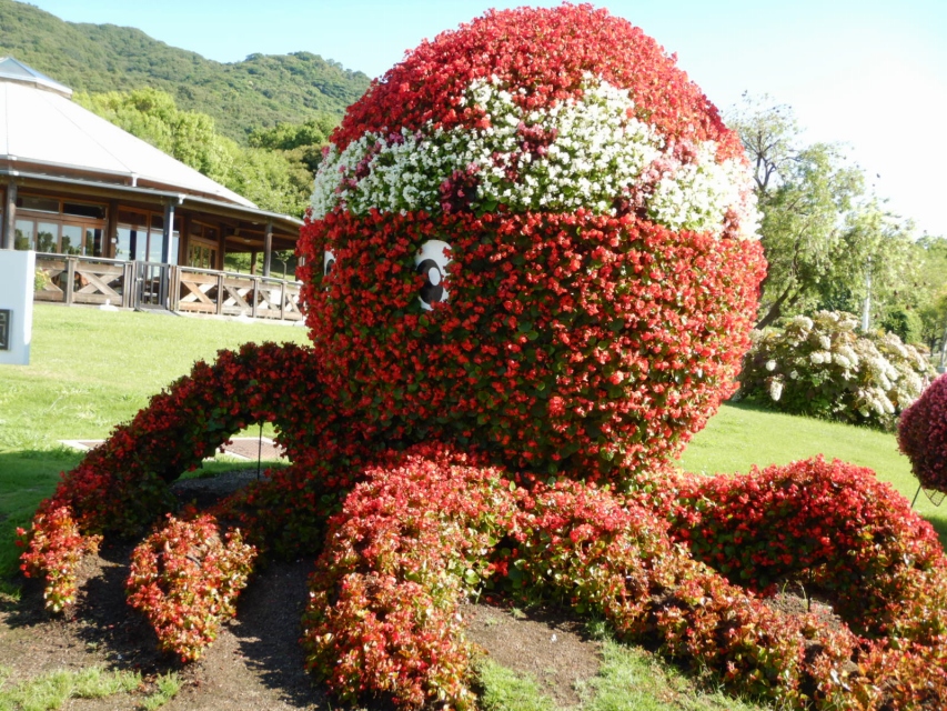 立体花壇「タコトピアリー 」「花火鳥」のベゴニア&「アヒル」のコリウス(場所:東浦口ゲート前・大地の虹)