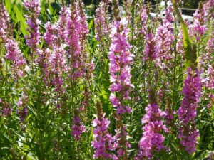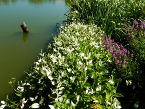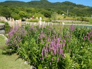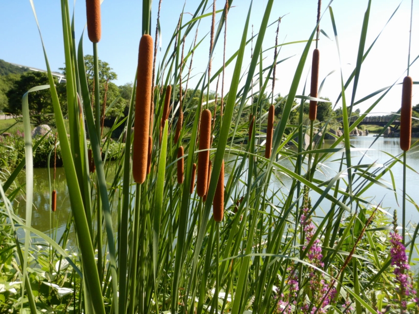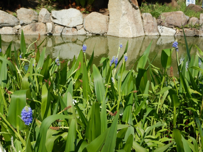 ピンク色のミソハギ、青いポンテデリア、茶色の棒のようなガマは、 周囲の雑草が伸びてきて邪魔しない限り、まだまだ見ごろは続きます。