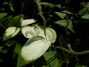 ハンゲショウは「半夏生」とも「半化粧」とも書くように、この時期に葉っぱが化粧(おしろい)をしたように白くなりますが、ピークを過ぎ、徐々に緑色に戻っています。白い状態をご覧になりたい方はお急ぎください。