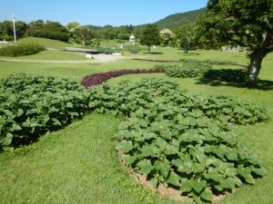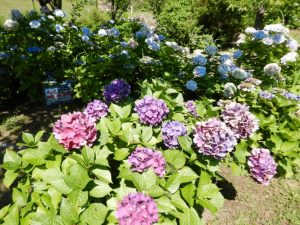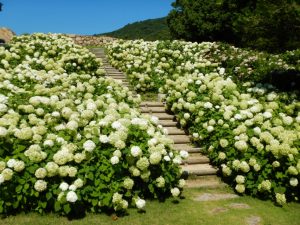写真一・二枚目:天壇テラス下のアナベル、三枚目:空のテラス横の西洋アジサイ、四枚目:せせらぎ広場の西洋アジサイ