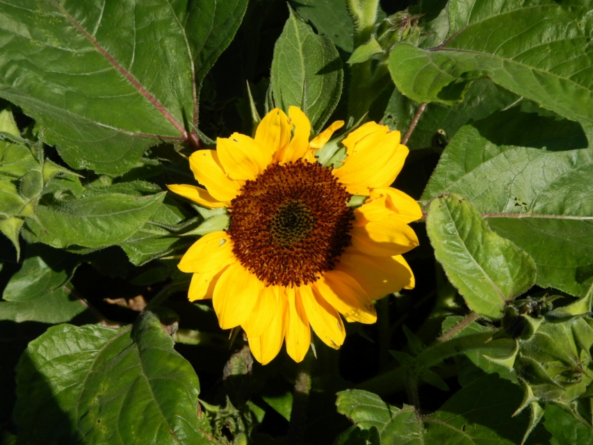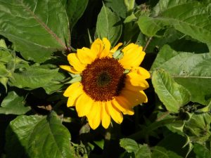 真夏と言えば背の高いヒマワリ!かもしれませんが、移ろいの庭に植えたヒマワリは、ひざ丈くらいの小柄なヒマワリ。ちっちゃいですが、見ごろの時期はお花の形の花壇を埋め尽くし、かわいいんですよ。
