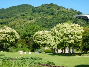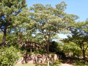 ホワホワ~ッと白っぽく見える大きな木、シマトネリコ。でっかい木なのに花枝がレース模様のように繊細で、とってもきれいなのです。是非近くに寄って見てみてください。