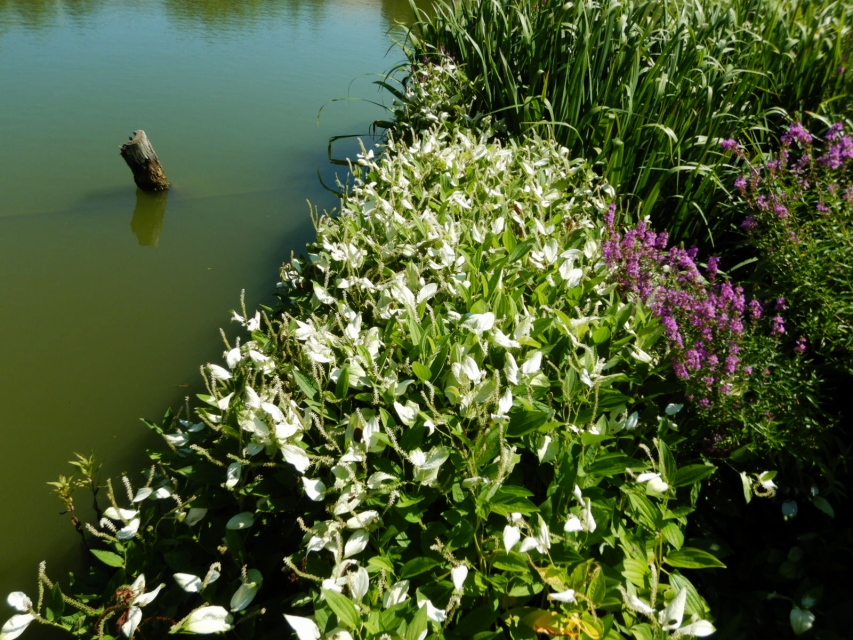写真一枚目:花火鳥そば、二枚目:ハンゲショウ、三・四枚目:ミソハギ、五枚目:ポンテデリア、六枚目:ガマ