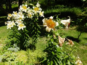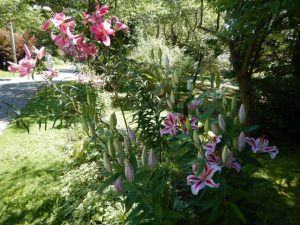 松の谷と花の谷の間の園路沿いで、6月末からユリが咲いています。ポプラの丘に近い方に植えてあるユリ(白や黄色)はこれから散っていきますが、そこより松の谷に近いあたりのユリ(主にピンク色)は見ごろになっていきます。少しずつですが複数種のユリを植えていますので、何かしら咲いていると思います。