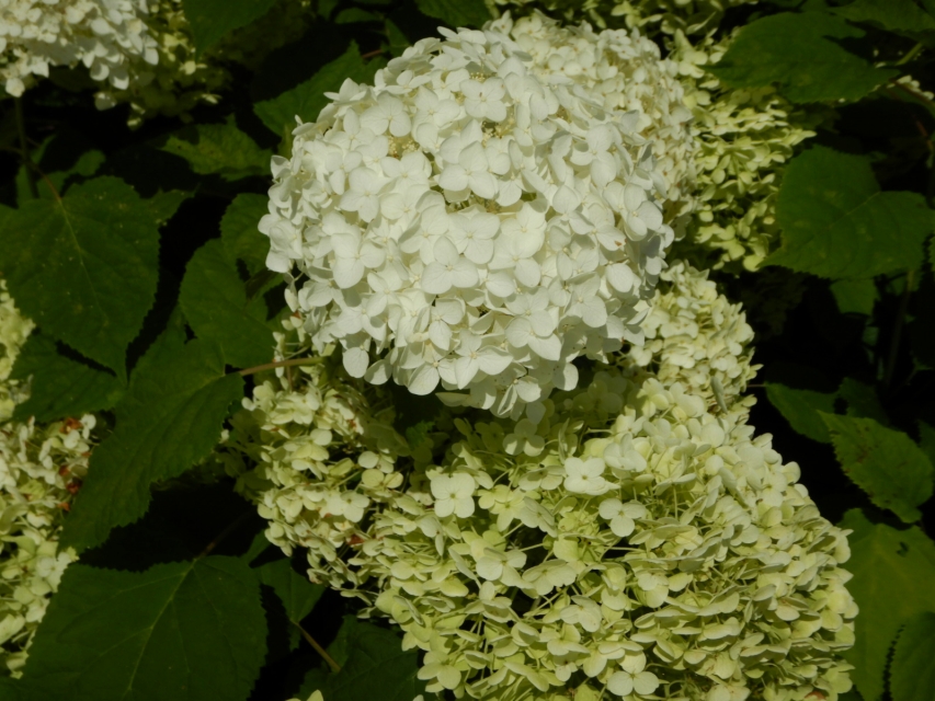 アナベルは見ごろを過ぎました。白から緑に戻りつつあり、一面真っ白だった場所が黄緑色に見えています。傷みはそれほど見られません。