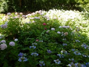 西洋アジサイやガクアジサイは、大半に茶色のシミが浮いてきちゃいました。色の濃いアジサイは、まだきれいに咲いている箇所もあったりします。