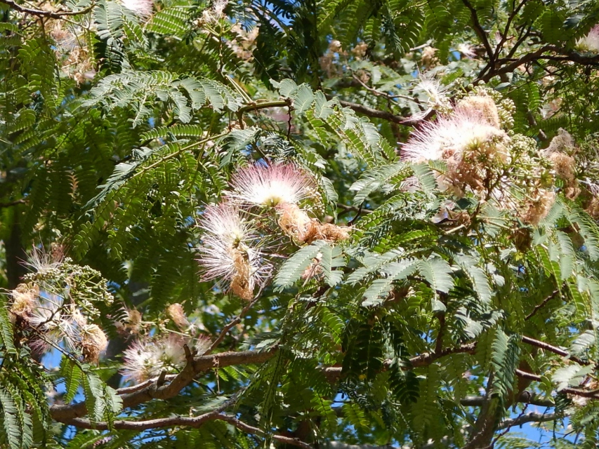 とっても繊細できれいな形の花のネムノキ。雨の日に大量に花が落ち、そろそろ終盤に近づいています。樹上高くにチンマリ咲いています。