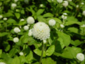 コロコロ丸くてかわいいセンニチコウ。1つ1つの花のかたまりが小さいため、ひいて撮った写真はいまいちパッとしません。写真を撮る際には寄り気味をお勧めします。白のセンニチコウは充実してきたので、若干ひき気味でも見られるかな。