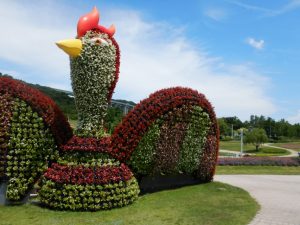デンとそびえ立つ花火鳥。4メートルもの高さで、鳥本体から尾羽の先までは30メートルもあります。先々週は本体の花がら摘み、今週は尾羽の花壇の雑草を除去したため、今とってもきれいです!