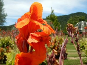 青空に映えるオレンジ色。暑い中せっかく公園に来られましたら、‘The 夏!’といった感じのカンナと是非記念撮影を!大きくて迫力ありますよ。
