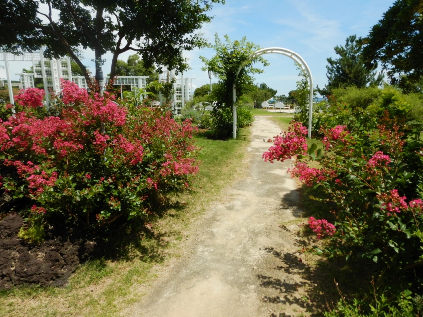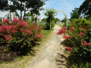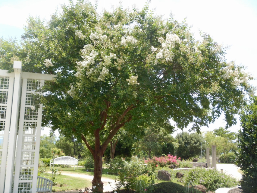 当公園、なぜかサルスベリ類の開花が遅いのです。園内各所にちょっとずつあるのですが、そのうち移ろいの庭のサルスベリ類は見ごろとなってきました。