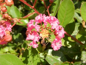 サルスベリはフリフリした6枚の花びらの付き方がユニーク。まとまって咲いている様子もいいですが、単品の花がかわいいので、是非近くに寄って見てみてください。