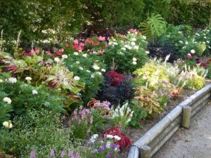 連絡口ゲートから入った時に突き当りに見えてくる花壇が半円形花壇です。今年もここに派手な葉っぱを主として植えています。これからもっとモリモリしてきますよ。