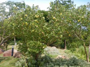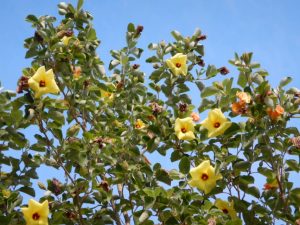 2~3mほどの木に、オクラの花にそっくりな黄色の花が咲いています。花をじっくり見るとハイビスカスにも似ていることがわかります。一日花(1日で咲いてしぼんで落ちる花)なので毎日新鮮な花が咲くのはいいのですが、開花数が予想つかず、昨日今日は少なめでした。まだつぼみはあったので、もう少し咲くと思います。アオノリュウゼツランを見るついでにどうぞ。