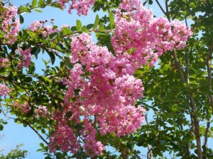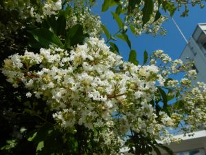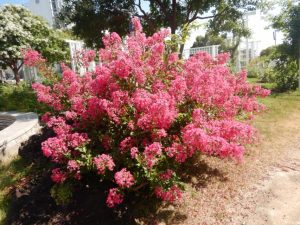 サルスベリはフリフリした6枚の花びらの付き方がユニーク。まとまって咲いている様子もいいですが、単品の花がかわいいので、是非近くに寄って見てみてください。