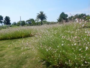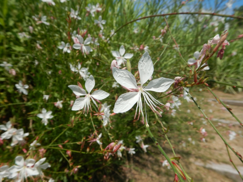 風にユラユラ白い蝶が飛んでいるような花、ガウラ。秋まで咲き続けます。海岸口ゲートそばは青空、青い海と一緒に観賞できます。ちょっと見るだけでよければ、移ろいの庭階段花壇横に咲いていますよ。