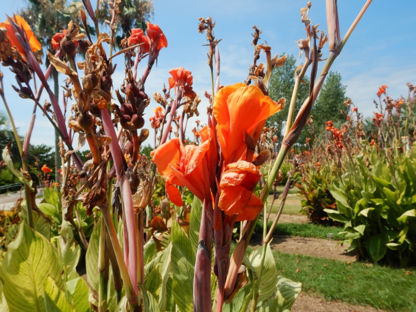 青空に映えるオレンジ色。暑い中せっかく公園に来られましたら、‘The 夏!’といった感じのカンナと是非記念撮影を!大きくて迫力ありますよ。