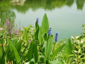 ピンク色のミソハギ、茶色の棒のようなガマは見ごろです。真夏は開花量に波がある水色のお花(ポンテデリア)は、開花数が少ないながらも涼しげなお花がきれいです。