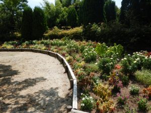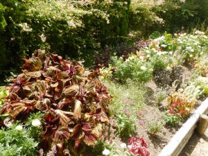 連絡口ゲートから入った時に突き当りに見えてくる花壇が半円形花壇です。今年もここに派手な葉っぱを主として植えています。これからもっとモリモリしてきますよ。