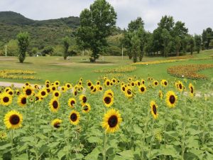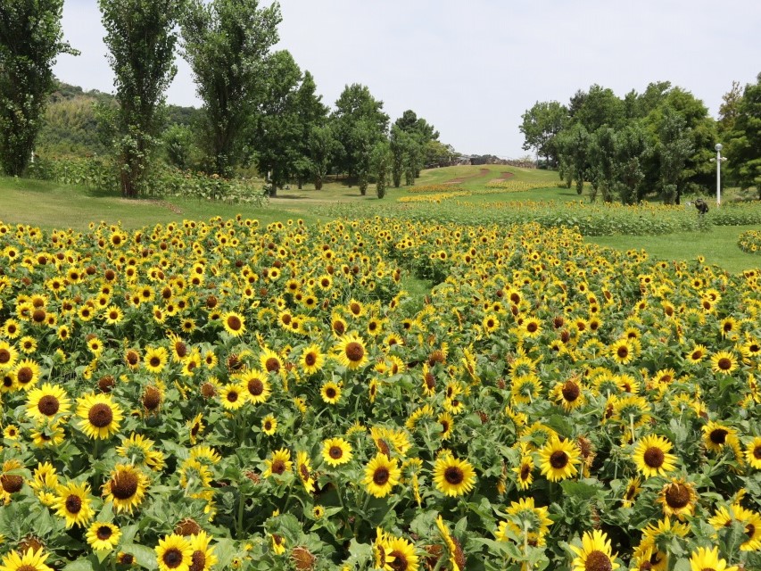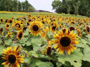 ポプラの丘で見ごろです。今年は全般的に高さが低めの品種を植えていますので、お子様やワンちゃんとの記念撮影に向いていますよ。8月上旬くらいまではお楽しみいただけるかと思います。