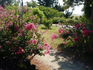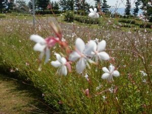 風にユラユラ白い蝶が飛んでいるような花、ガウラ。秋まで咲き続けます。海岸口ゲートそばは青空、青い海と一緒に観賞できます。ちょっと見るだけでよければ、移ろいの庭階段花壇の横に咲いていますよ。